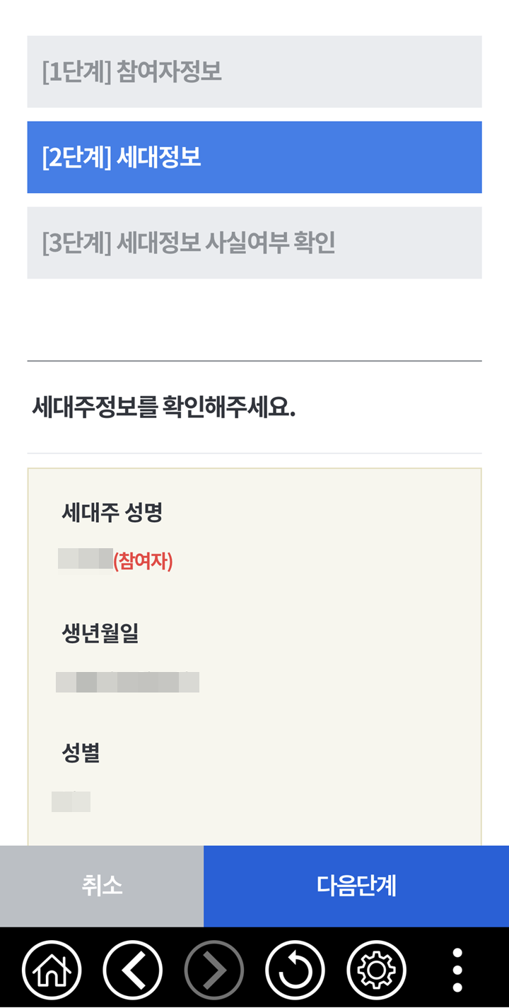 참여자정보 확인 후에 2단계로 세대 정보를 확인합니다. 여기에서는 세대주 정보를 확인합니다. 세대주 성명, 생년월일, 성별을 확인하고 다음 단계로 넘어갑니다.